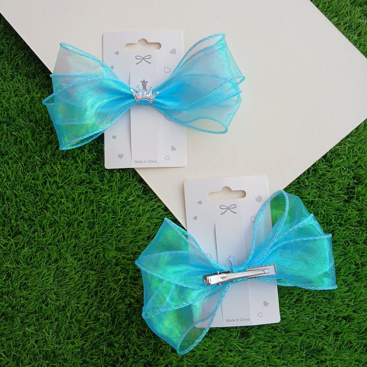 It’s a ice blue hairbow with alligator clip at the back and crown on top.