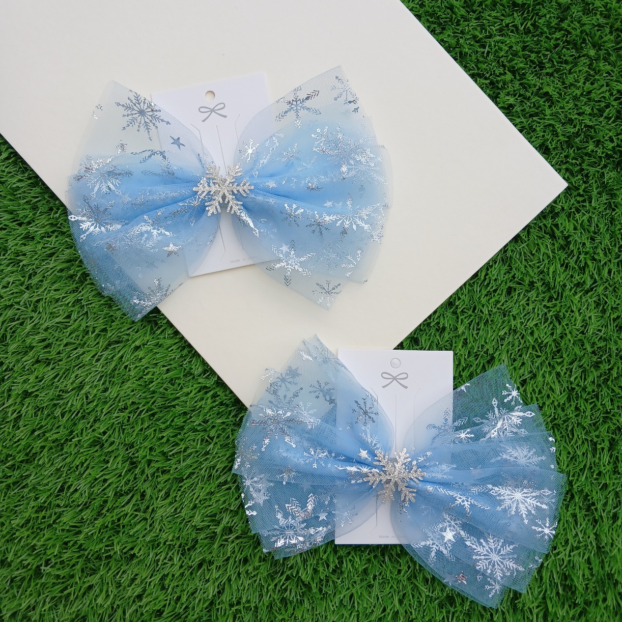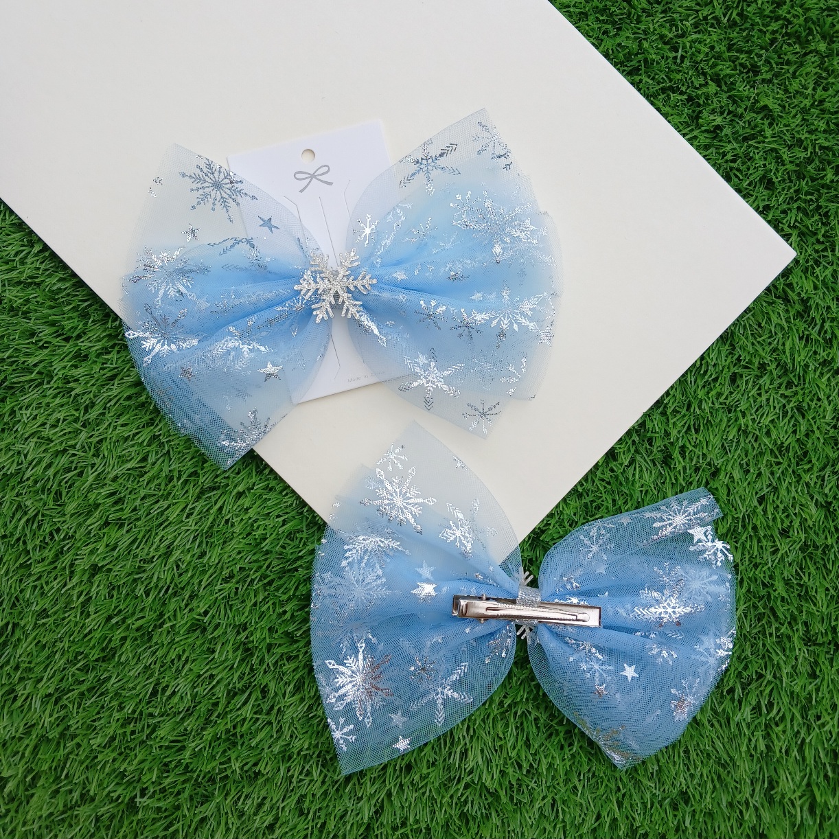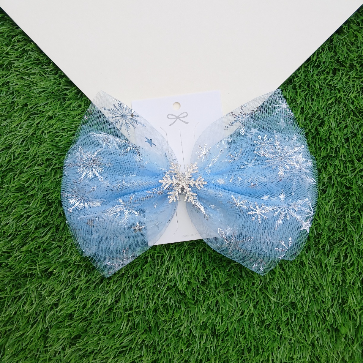 Light blue snow flake bow. Size: Six inch Quantity: sold as single piece.