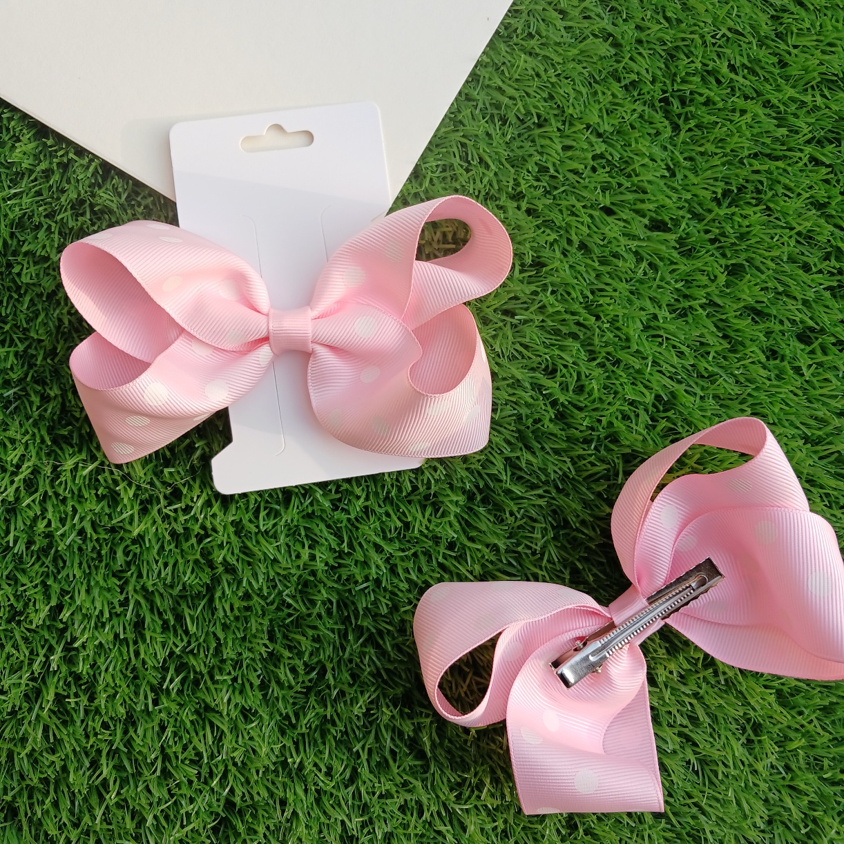 Pink bow with white polka dots. Size: 5 inch Quantity: Sold as a single piece.