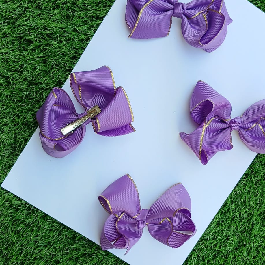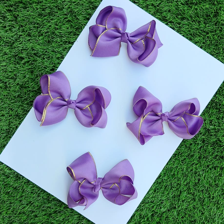 A Purple bow with gold border and alligator clip at the back. Color and size may vary due to manual measurement. Size: 4 inches.