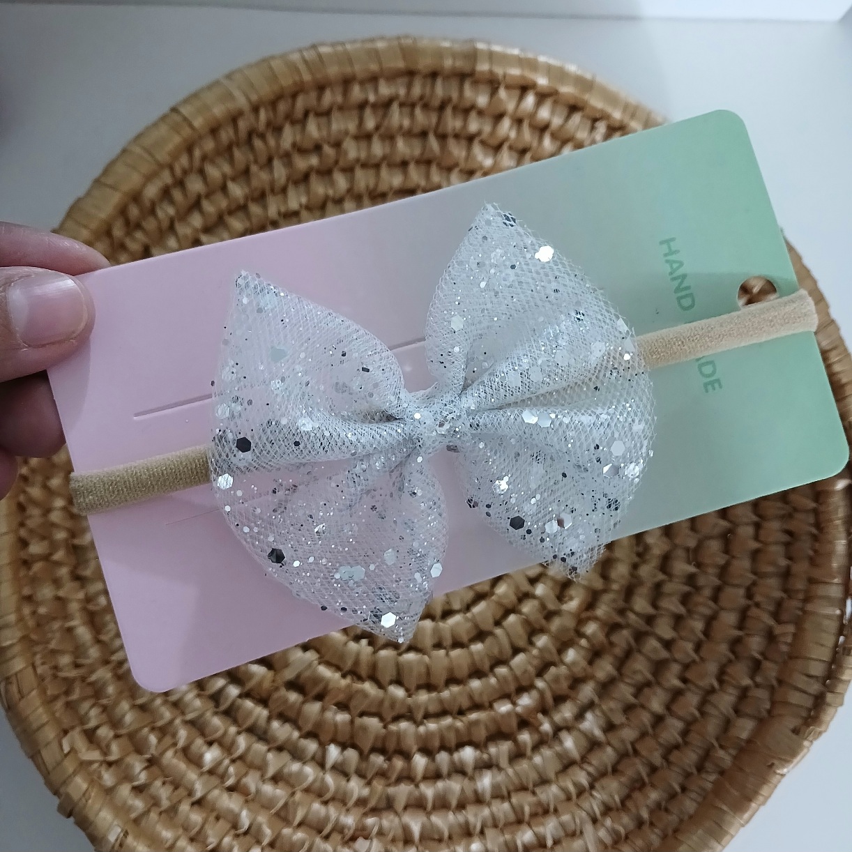 Beautiful silver headband for little ones. Perfect for newborn till 2 years. Stretchable nylon headband. Size: 3 inches bow with stretchable band.